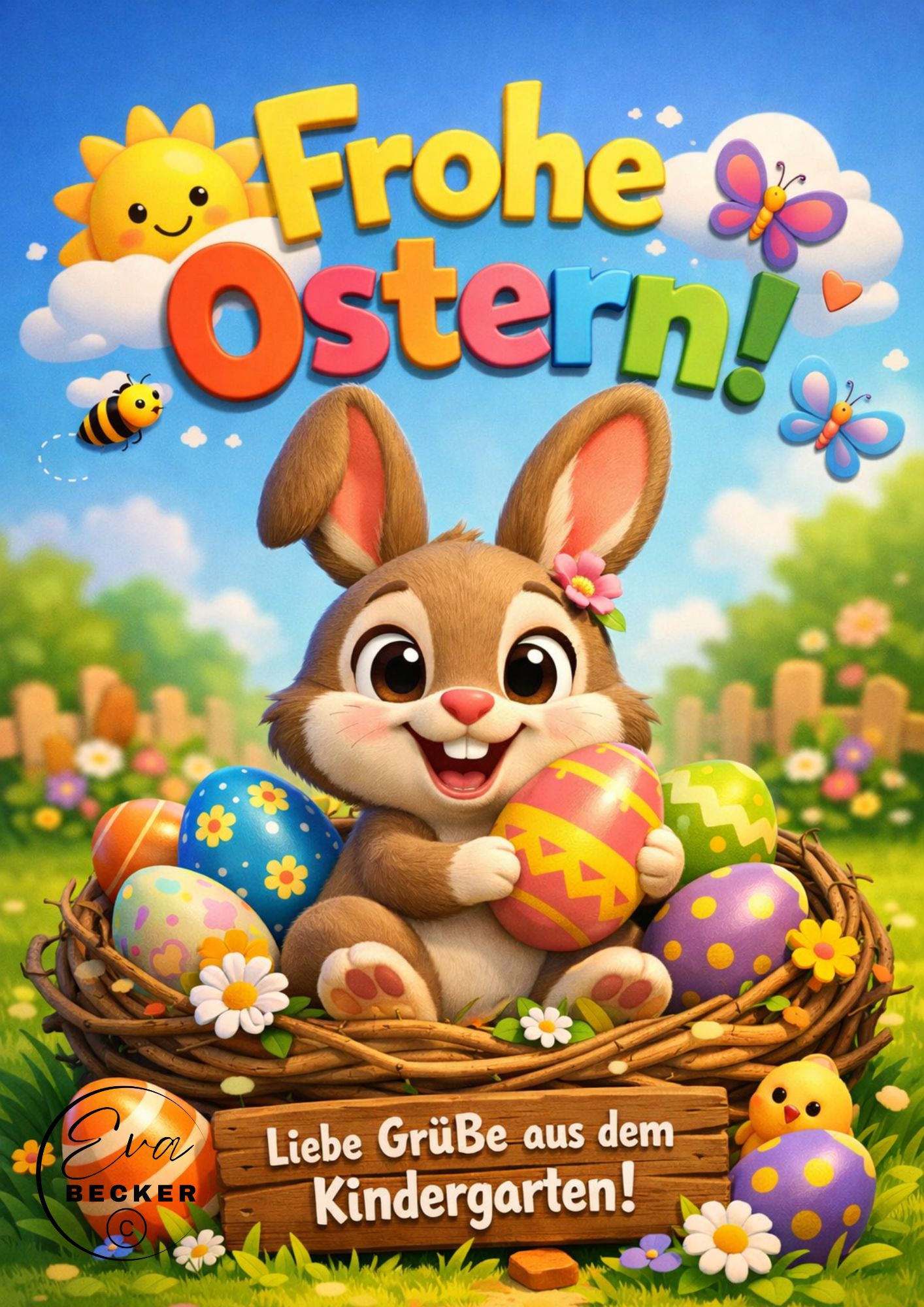 der kleine Osterhase hat fleißig für euch bunte Eier versteckt und wünscht euch und sonnige eine fröhliche Osterzeit!