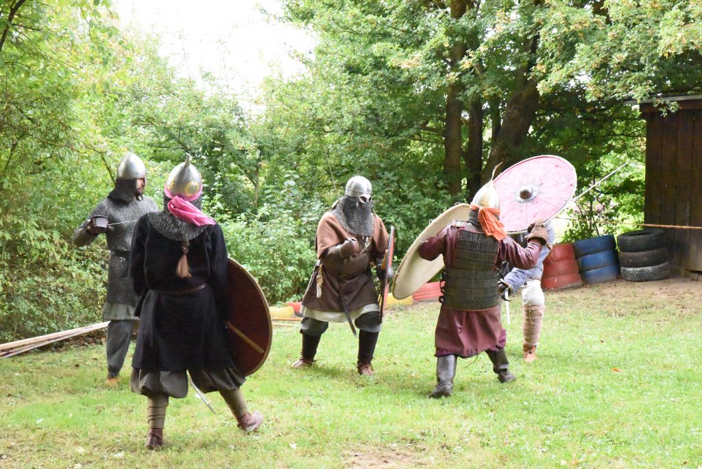 Ein Höhepunkt war der Besuch der echten Wikinger des Vereins Tyrs Fimbulvetr. Mit ihrer beeindruckenden Show, den ausgestellten Waffen, Schilden und Rüstungen ließen sie Groß und Klein staunen. Auch eine Kräuterfrau bereicherte das Programm: Sie stellte verschiedene Kräuter vor und zeigte außerdem, wie aus der Wolle eines Schafes der Faden zum Weben entsteht.
